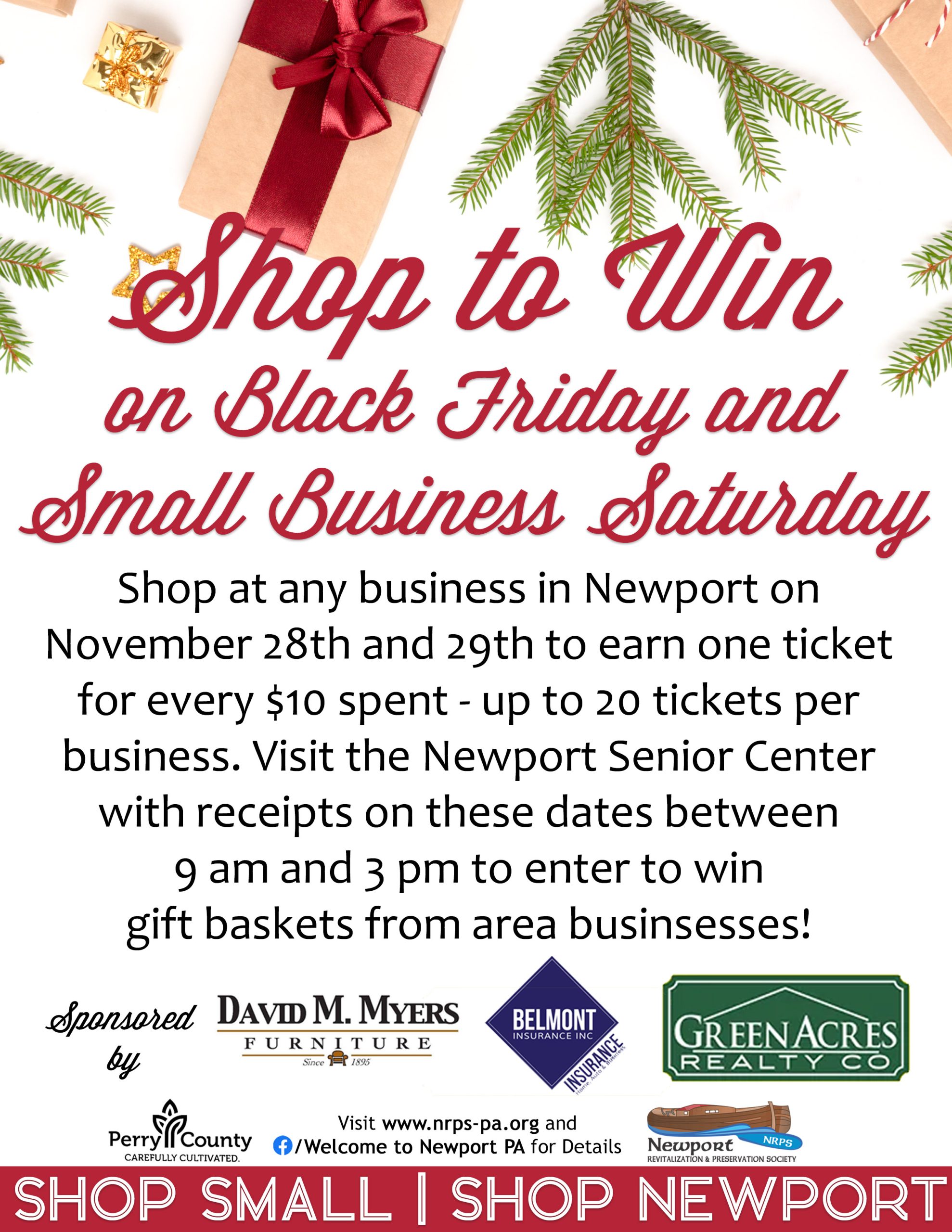 Visit the Newport Senior Center at 2 North Second Street with receipts on these dates between 9 am and 3 pm to receive tickets to enter a raffle with gift baskets donated by area businesses!